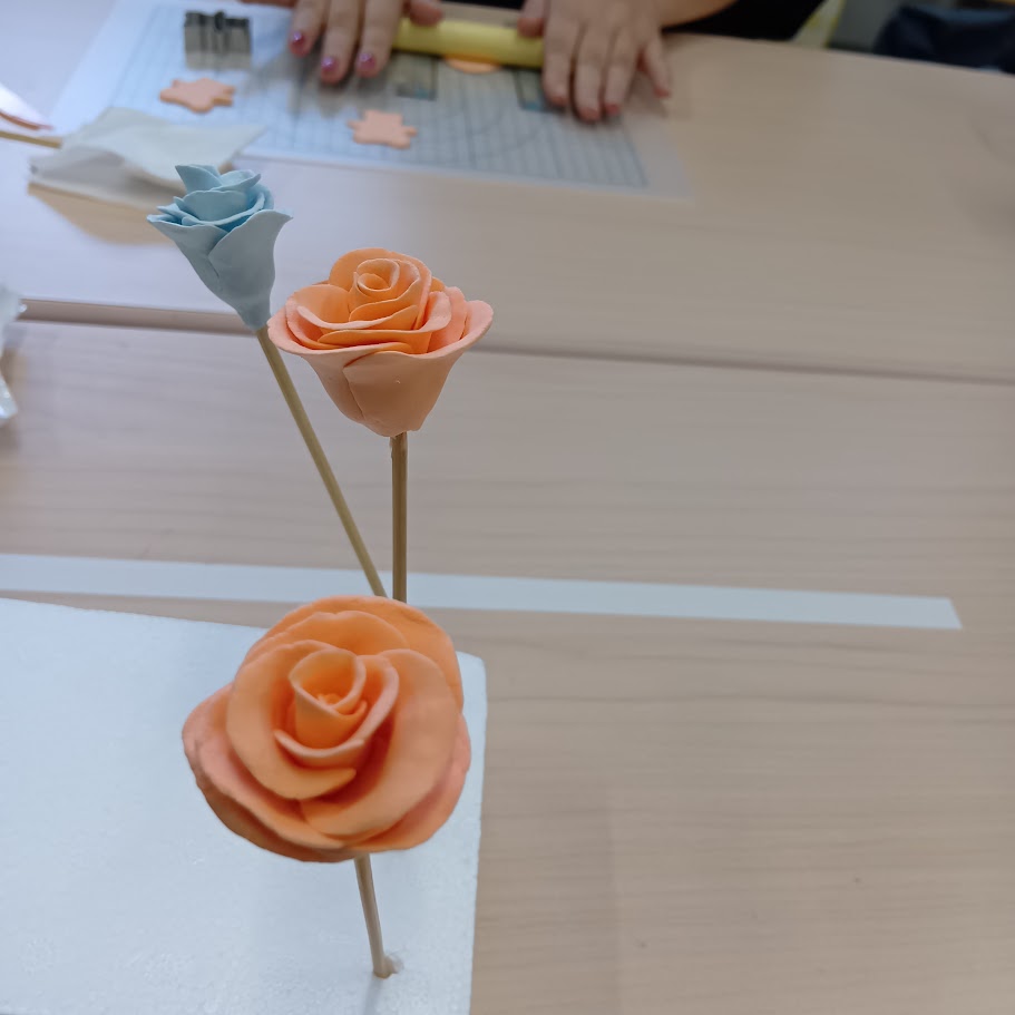 紙粘土を薄くのばして、綺麗なバラを製作中です。